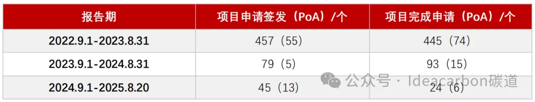获得CER签发的项目数量:EB本年度批了24个项目,6个PoA,相较于过去两年的数量同样大幅下降——环比分别下行94%和74%。年递减率在2024年也达到峰值79%。