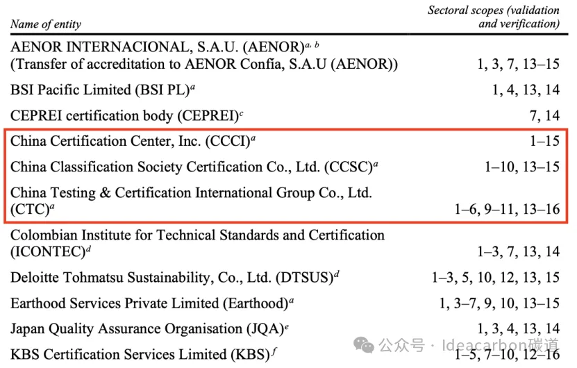 有2家DOE自愿完全退出认证:哥伦比亚技术标准和认证研究所(ICONTEC)和德勤东日本可持续发展有限公司(DTSUS);1家新的DOE通过:KBS认证服务有限公司(KBS);6家DOE续了资质(下图),最后能干活的DOE从29家变成28家(少了1家)。“裁判”中包括三家中国机构,它们分别是:华夏认证中心有限公司(CCCI)、中国船级社质量认证有限公司(CCSC)以及中国建材检验认证集团股份有限公司(CTC),均被授予为期五年的认证资质。