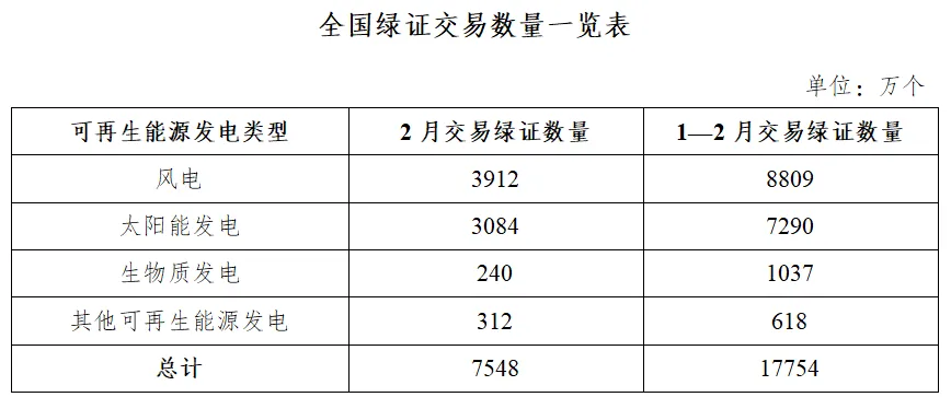 2026年2月,全国交易绿证7548万个,其中绿色电力交易绿证2996万个。
