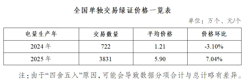 2026年2月,全国单独交易绿证4552万个,其中电量生产年为2024年的绿证交易722万个,平均价格1.21元/个;电量生产年为2025年的绿证交易3831万个,平均价格5.90元/个。