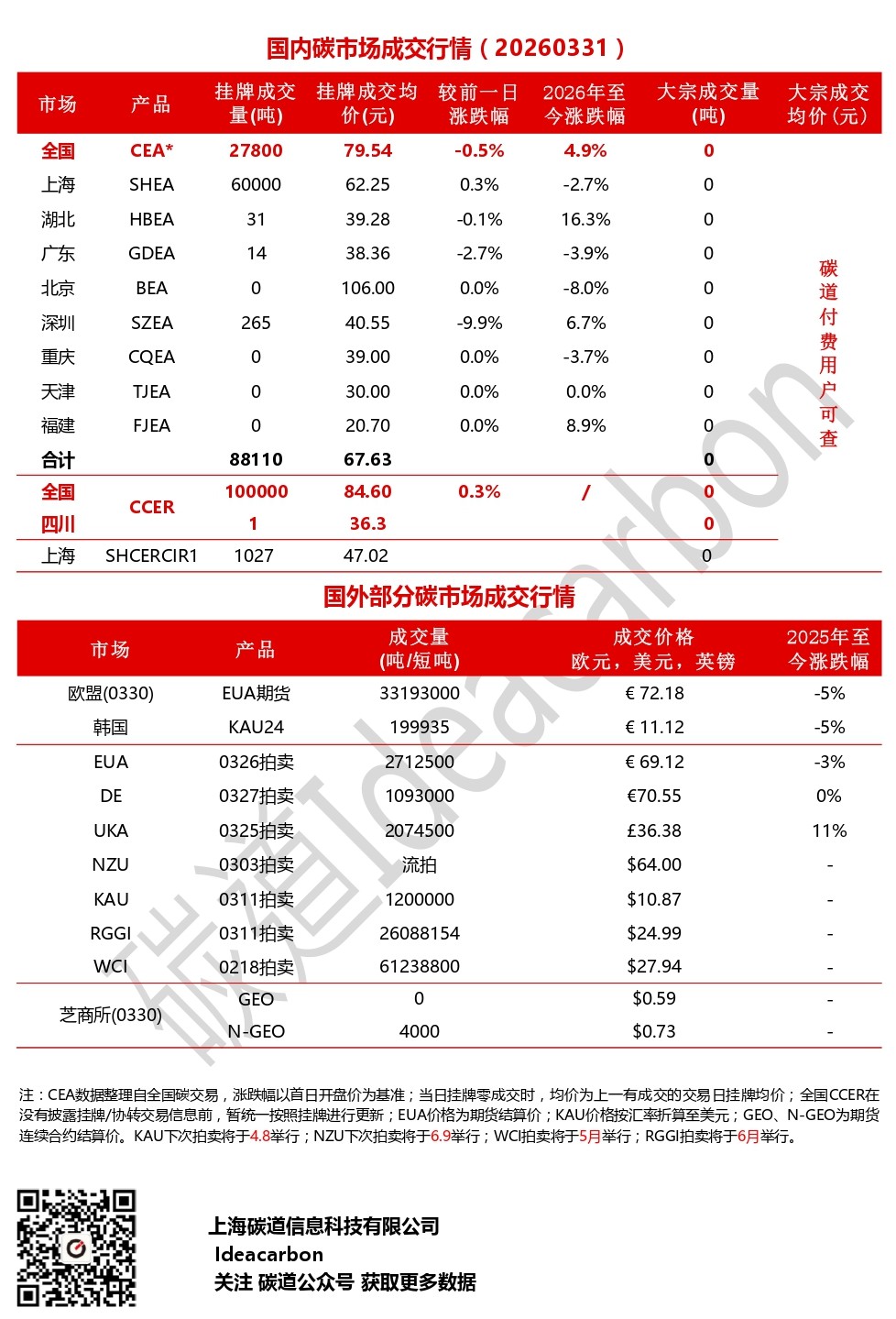 每日碳市场成交行情(20260331)